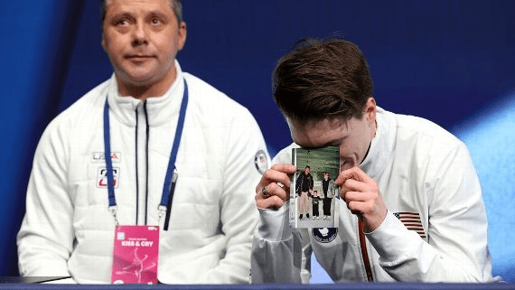 “I’ve been inspired by them since day 1, ever since we stepped on the ice together,” said Naumov, who brought an old photograph of that moment to the kiss-and-cry at the Milano Ice Skating Arena, the little tyke standing between his parents as he stepped foot on the ice for the first time, the three of them all smiling for the camera.